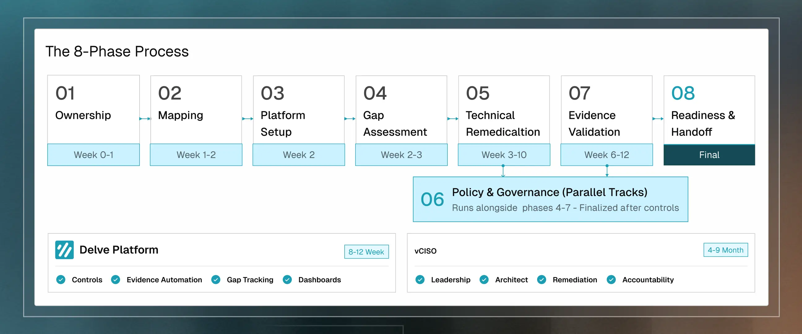 Delve gives you the platform: control frameworks, evidence automation, and gap tracking. Com-Sec gives you program leadership: vCISO accountability, technical remediation, and security architecture.